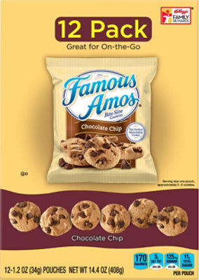 Famous Amos Products, Calories and Nutritional Information - FatSecret Calorie and Nutrition information for popular products from Famous Amos: Popular Items: Chocolate Chip Cookies, Cookies, Sandwich Cookies, more... Famous Amos Chocolate Chip Cookies: Chocolate Chip Cookies. Per 4 cookies - Calories: 140kcal | Fat: 7.00g | Carbs: 20.00g | Protein: 1.00g Chocolate Chip Cookies (40g)