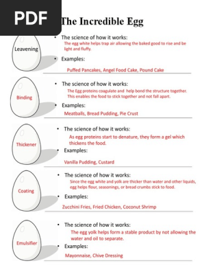 The Incredible Egg Worksheet KEY | PDF | Egg White | Egg As Food The Incredible Egg • The science of how it works: The egg white helps trap air allowing the baked good to rise and be Leavening light and fluffy. • Examples: Puffed Pancakes, Angel Food Cake, Pound Cake • The science of how it works: The Egg proteins coagulate and help bond the structure together.
